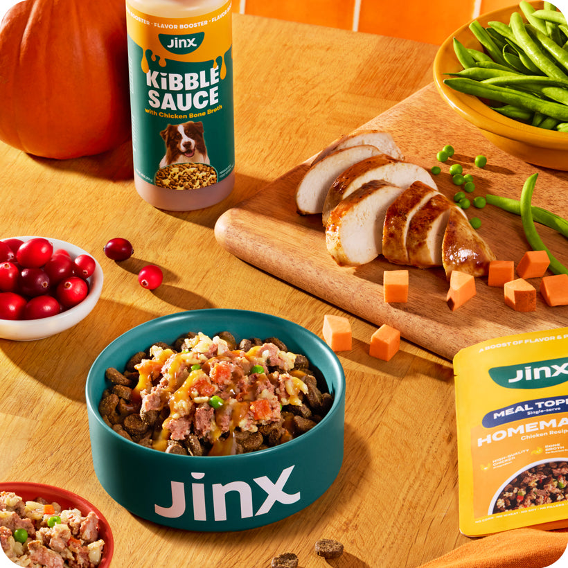 This year, let your dog in on the feast. Layer our premium kibble with wholesome Homemades, and finish with a drizzle of savory bone broth Kibble Sauce.